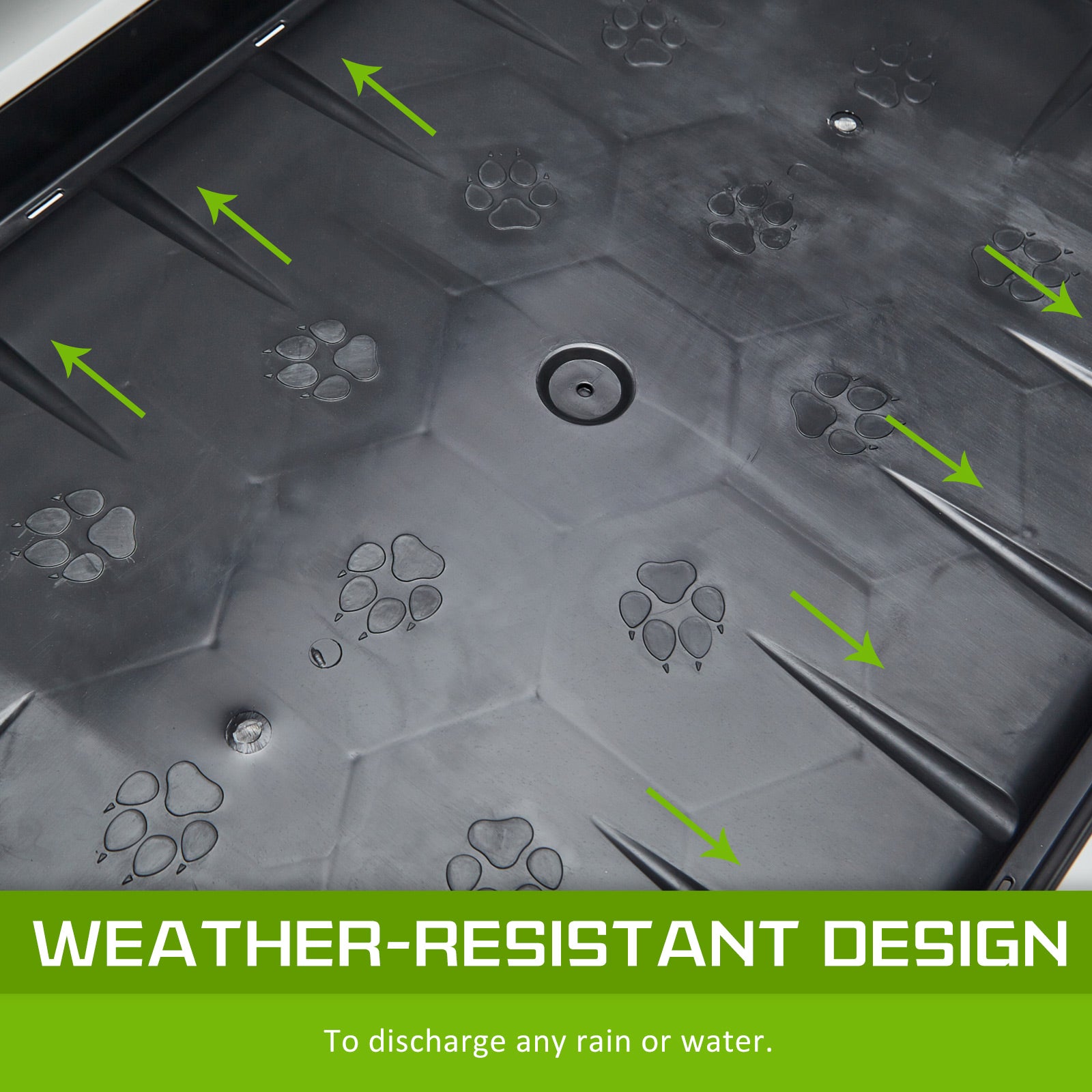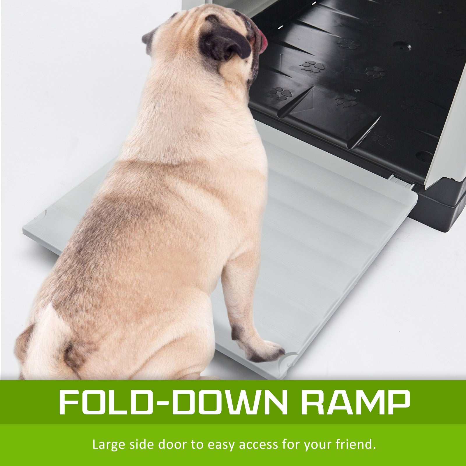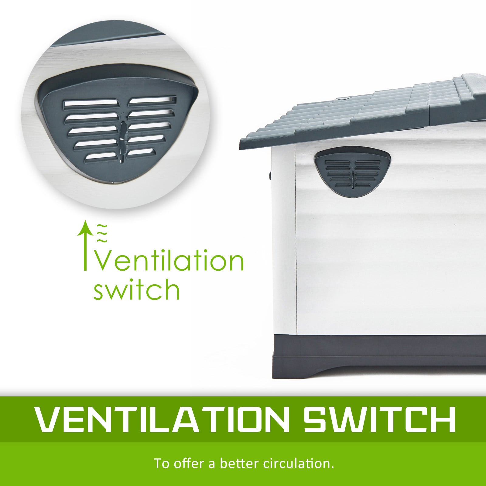 This kennel is raised on small legs , and this stop the damp and cold from penetrating the kennel floor. Designed for use indoors or outdoors, this durable plastic dog kennel which is weatherproof and UV stabilized. Vents at the front, side, rear and bottom help to ensure that your pet is kept well ventilated with fresh supplies of clean air.
